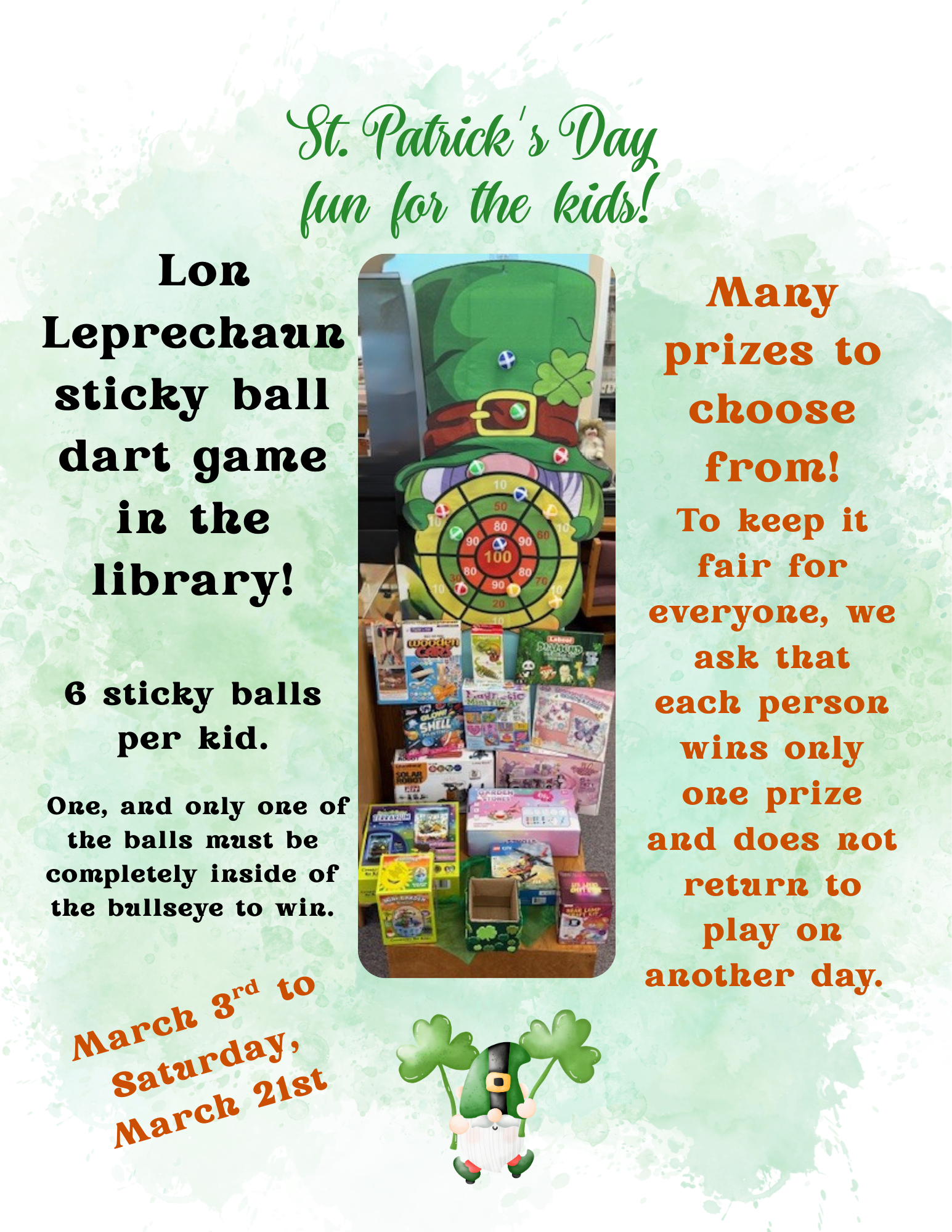 Sign up for this free club that meets every month. They read books of all genres and are open to suggestions and requests. Times and days are open for possible change. Stop in the library and talk with the librarian for more information. The February books will be available for checkout starting next week.