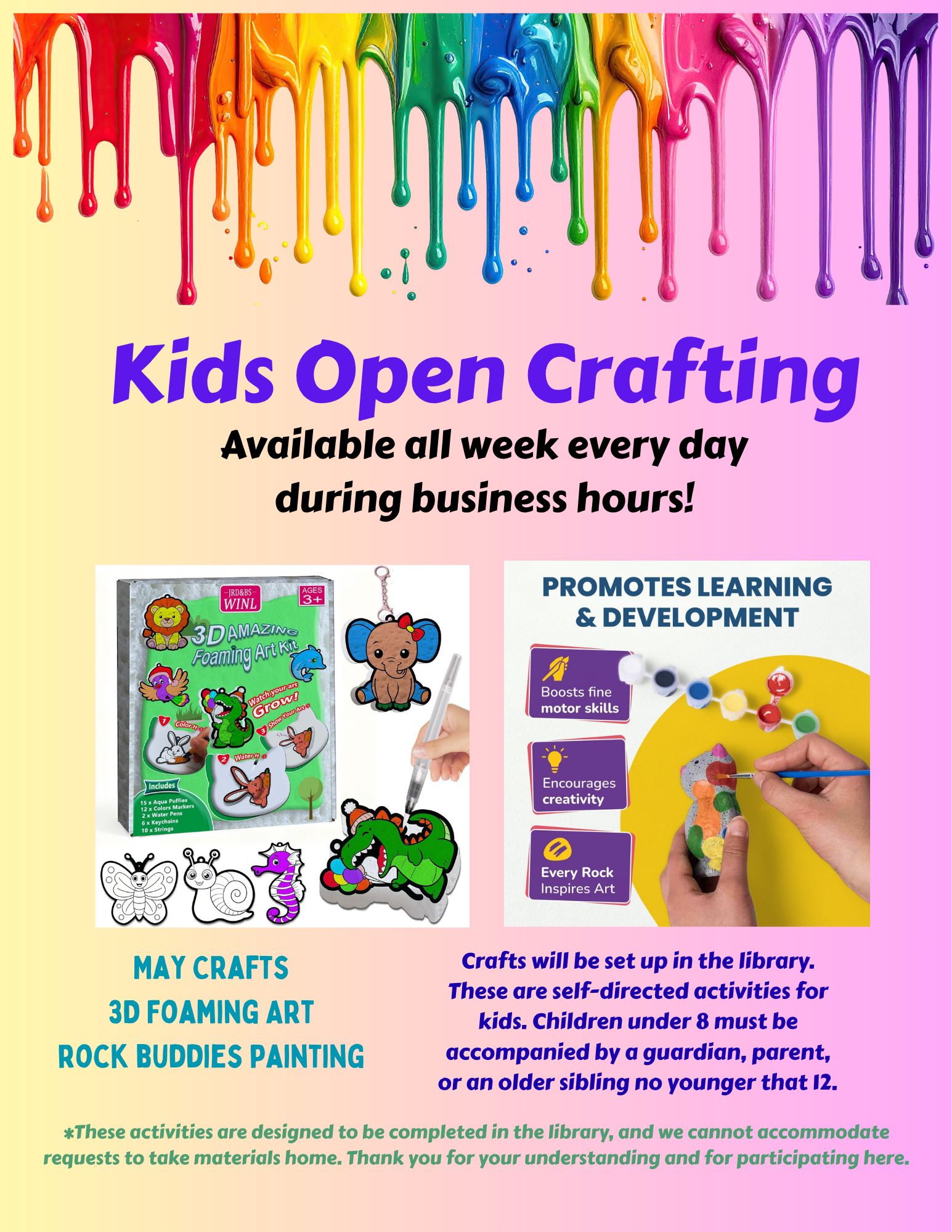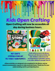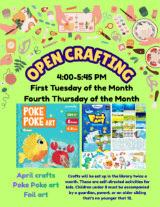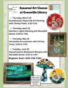 If you would like to preregister for any of these upcoming classes, please stop in the library or call 748-7332. There is no cost to you. These classes are a great way to spend time with family and friends and being creative. Our instructors would like to remind everyone that you DO NOT need to be an artist or an experienced crafter to participate in these programs. These classes are for your enjoyment and to maybe even learn a few things. If you have any questions about the classes, please call. We look forward to seeing you!