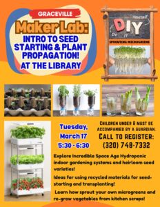 People of all ages are welcome to be a part of this amazing, and educational program. You will even be able to enjoy the fruits of your labor. The Seed Program is going to be at the library year round. We will have planters inside and outside. There will be two planters inside, one for classes and one for our community to come in and take a little of what they’d like. Some of the herbs/veggies will be used for kids cooking classes this summer also. We will be asking several people to take part in saving seeds to bring back to the library so that we don’t have to make annual seed purchases and may continue using non GMO seeds. I am soooo excited about this!!! Jason Frank and Gabby Johnson will be teaching these classes. There is no limit to how many would like to sign up, HOWEVER, you do need to register to participate. Thank you.