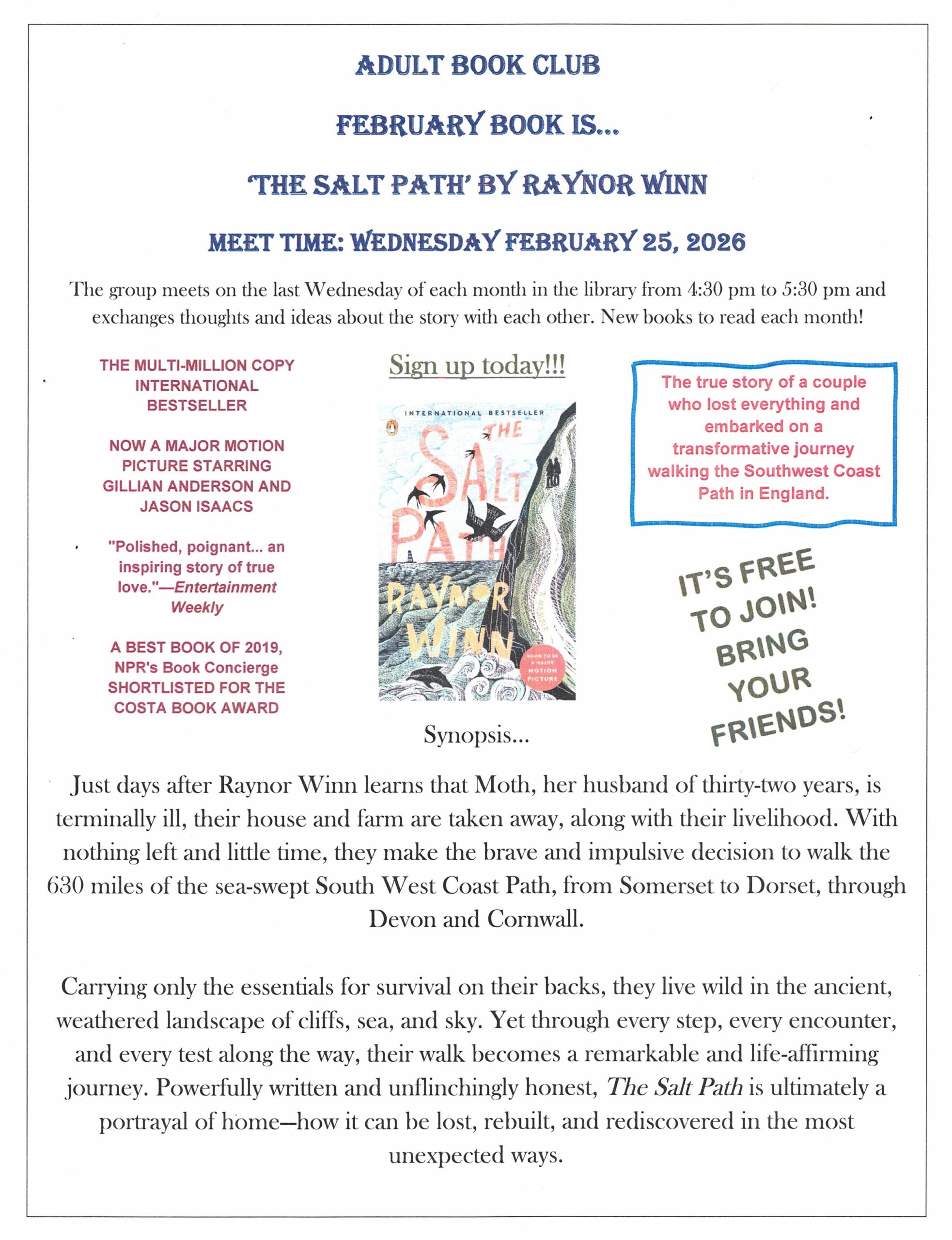 Sign up for this free club that meets every month. They read books of all genres and are open to suggestions and requests. Times and days are open for possible change. Stop in the library and talk with the librarian for more information. The February books will be available for checkout starting next week.